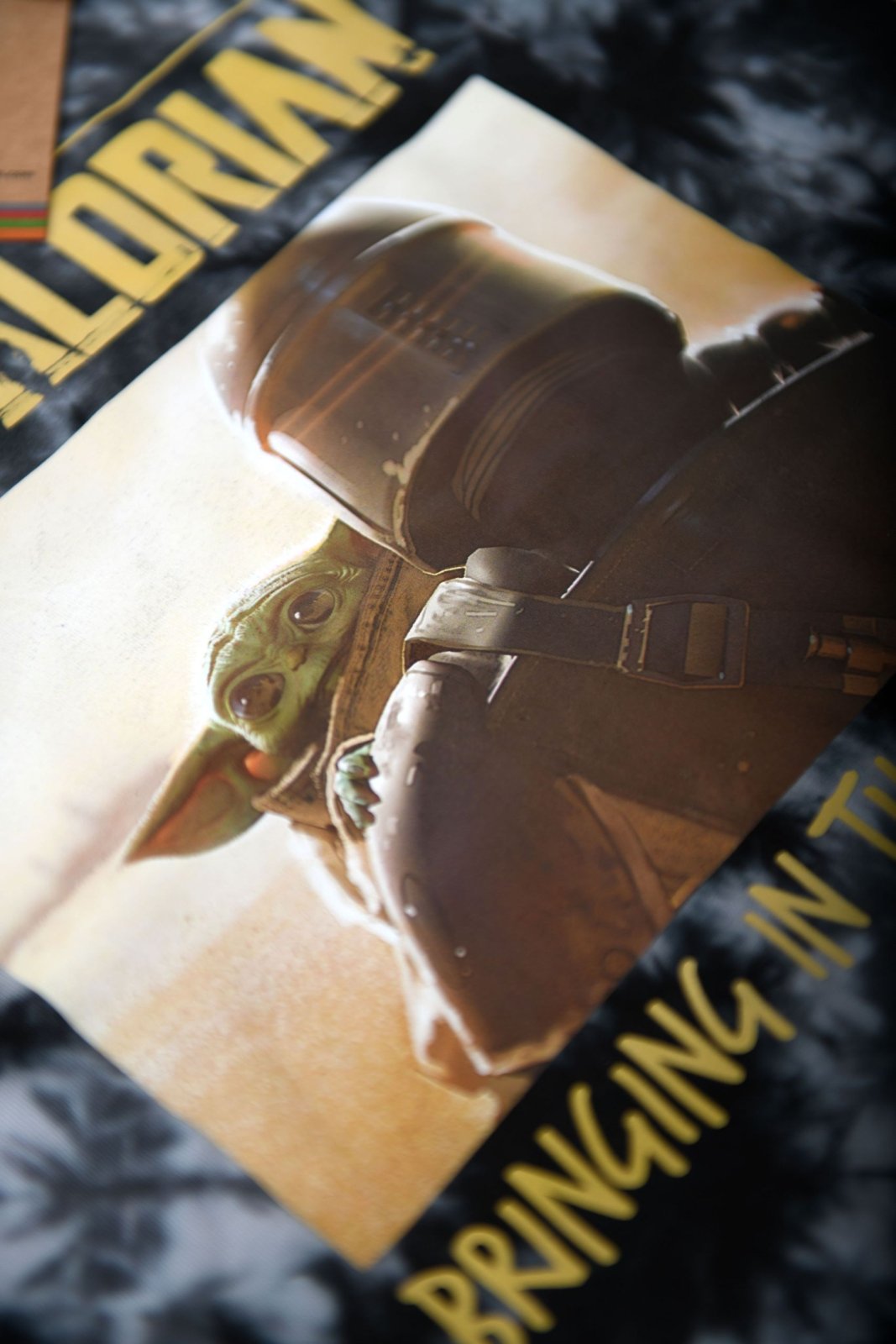Bringing in the bounty! Any little Star Wars The Mandalorian fanatic can drift off to the dark side in this official, super cool pyjama set. This set includes a green and black tie dye top featuring the cutest baby Yoda! Made using Organic Cotton for a super comfortable and sustainable nights' sleep Paired with a grey matching knee length short, mdade sustainably with 98% BCI cotton and recycled polyester, with a contrasting Mandalorian print to the hem.