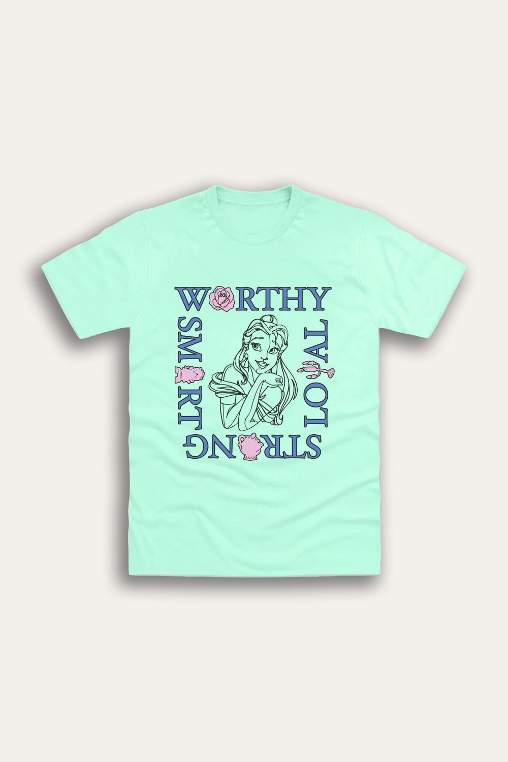 Step into confidence and grace with this Disney Princess Belle Ladies' Mint T-Shirt, celebrating Belle’s strength, intelligence, and loyalty. The chic, inspirational print showcases an elegant sketch of Belle surrounded by the words "Worthy, Strong, Smart, Loyal", making this a perfect pick for Disney fans who admire her courage and wisdom.