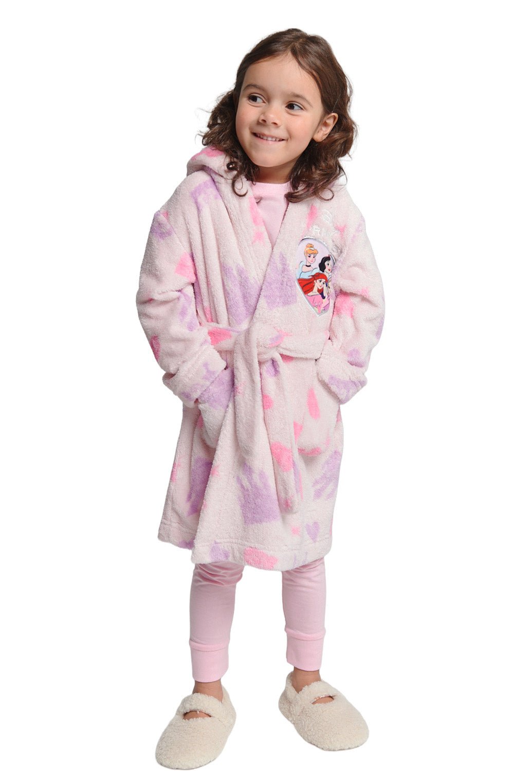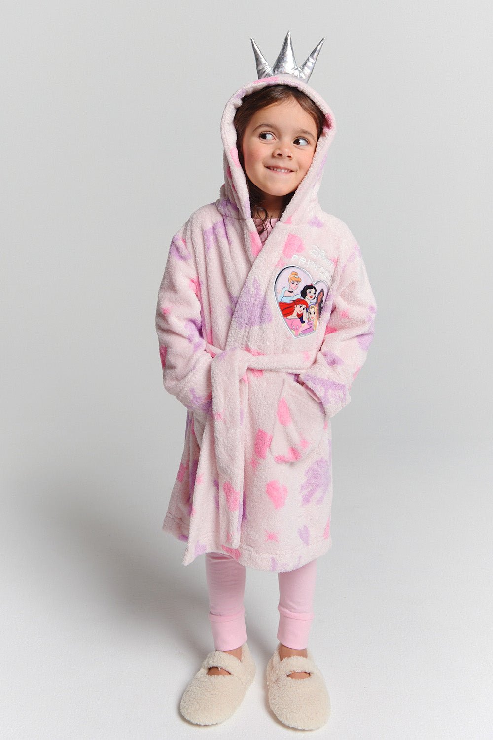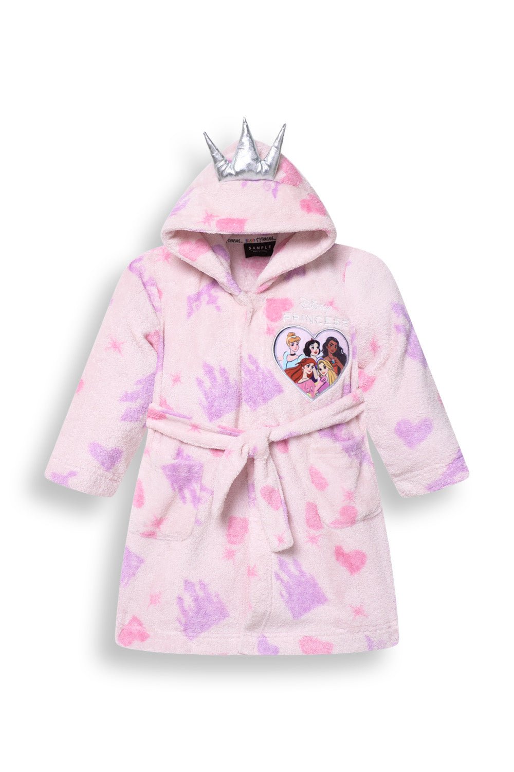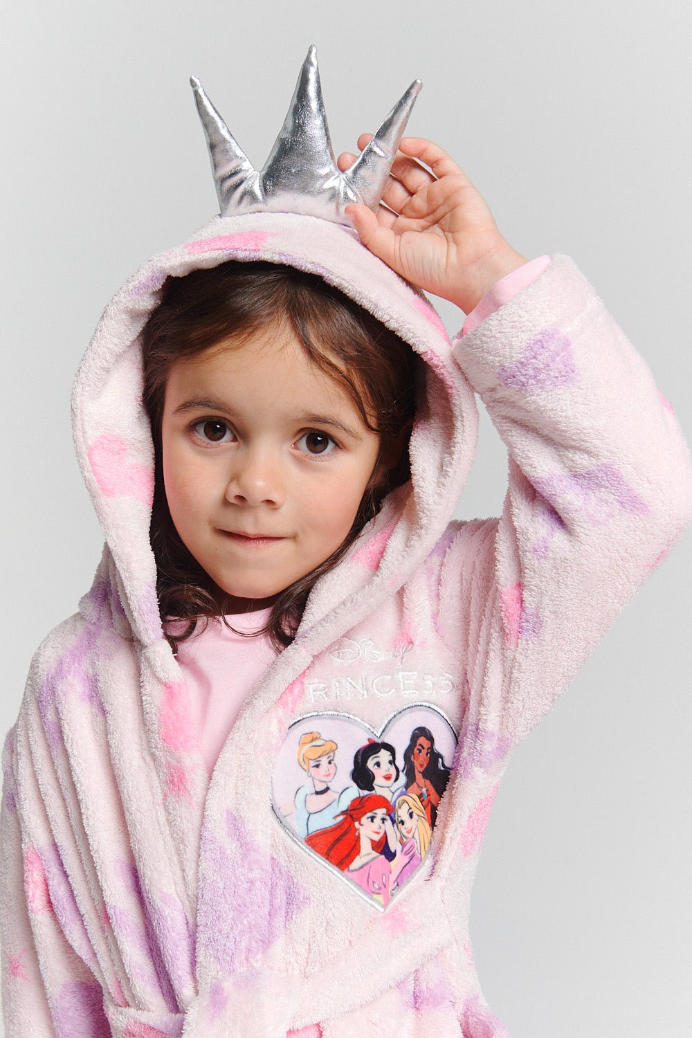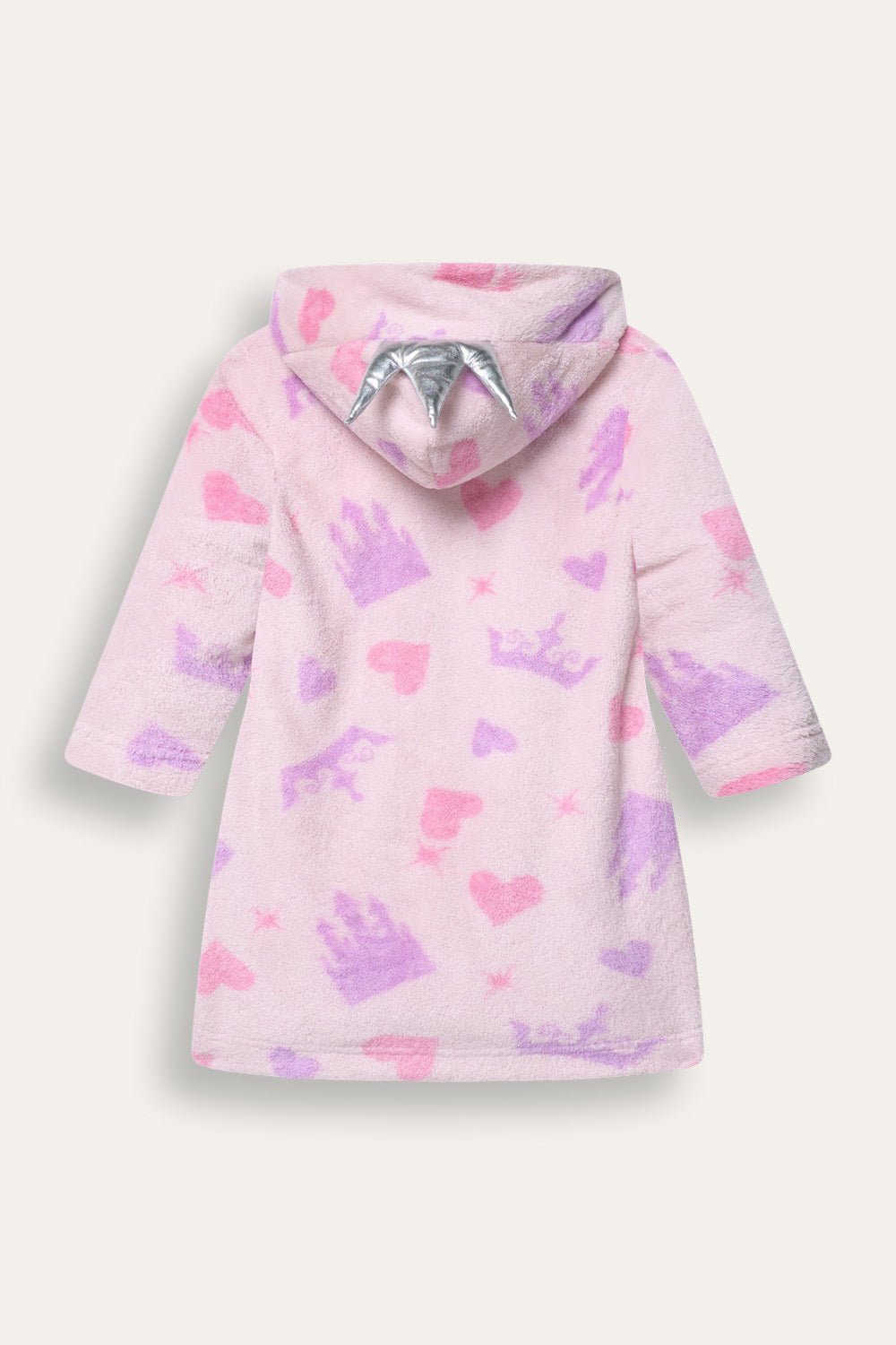 Transform bedtime into a royal experience with this Disney Princess Girls Fleece Robe, made for young dreamers who love fairy tales and magical moments. Designed in soft pink fleece, this robe features castle and heart prints, an embroidered princess badge, and a 3D glitter crown on the hood to complete the regal look.