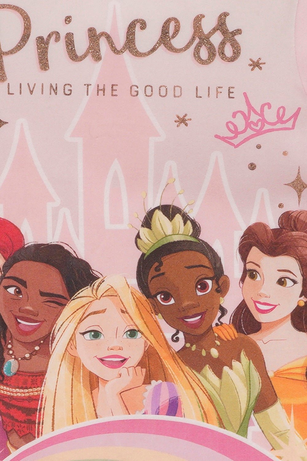 'Live the good life and dream of dresses, magic and royalty with Ariel, Moana, Rapunzel, Tiana and Belle. This sustainably made BCI cotton long sleeve pink top and full-length bottoms features a graphic print of the stunning Disney Princesses, dazzling glitter detail, rainbows, castles, crowns and all things magic! Available in sizes 3- 8 years. At Brandthreads.com we plant a tree to with every order in partnership with Ecologi.