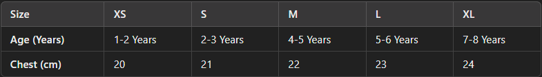 | Age | EU Height (cm) | US (size) | Weight (kg) | Chest (cm) | Waist (cm) | Sleeve Length (cm) | Hips (cm) |