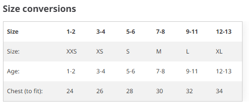 - Sizes 1–2, 3–4, 5–6, 7–8, 9–11, 12–13 Years
