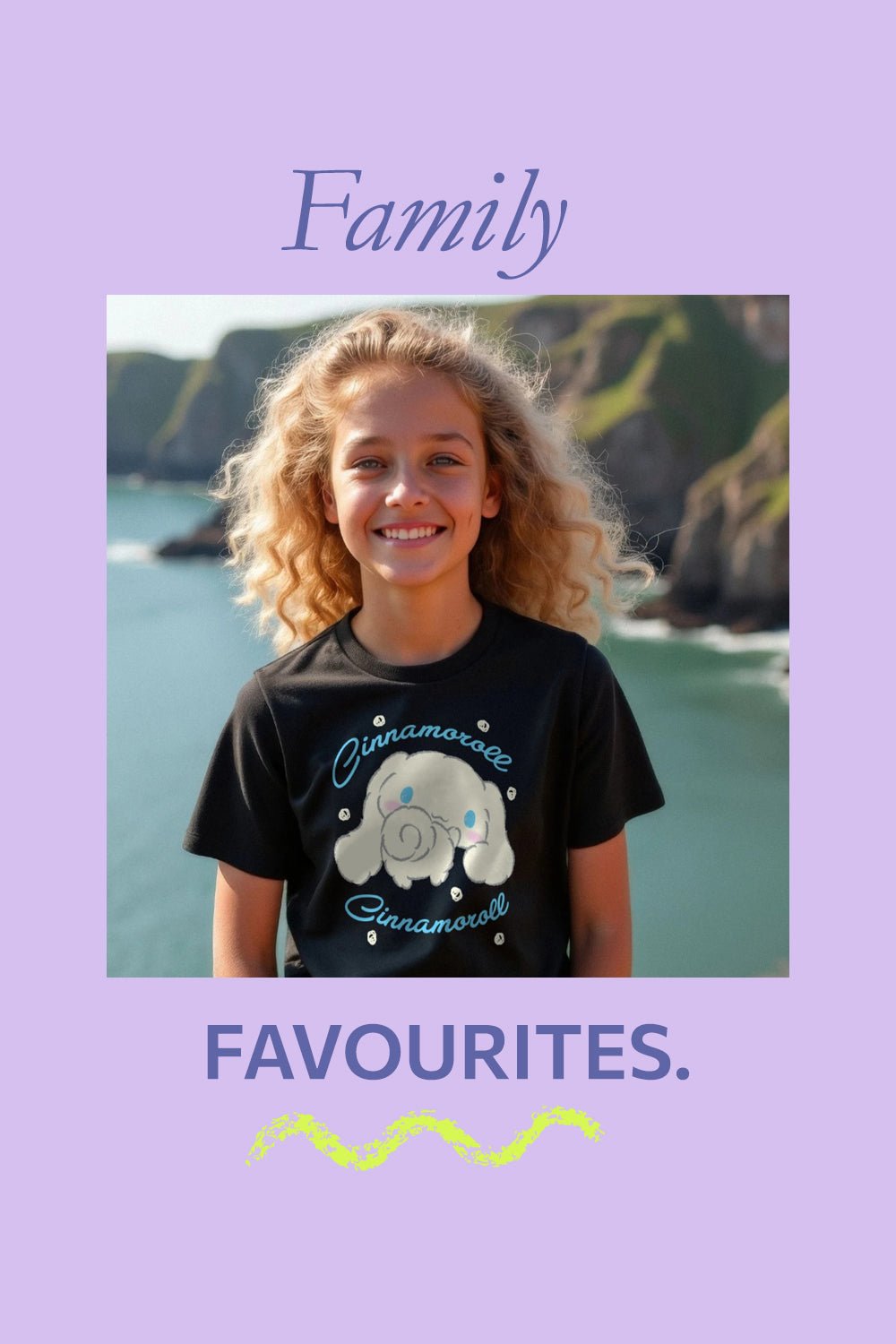 Show off your love for Sanrio with this Cinnamoroll Girls Black T-Shirt. Featuring the adorable Cinnamoroll character on a sleek black background, this tee blends style, comfort, and kawaii charm. Perfect for casual outfits, it’s a versatile choice for any Sanrio fan.
