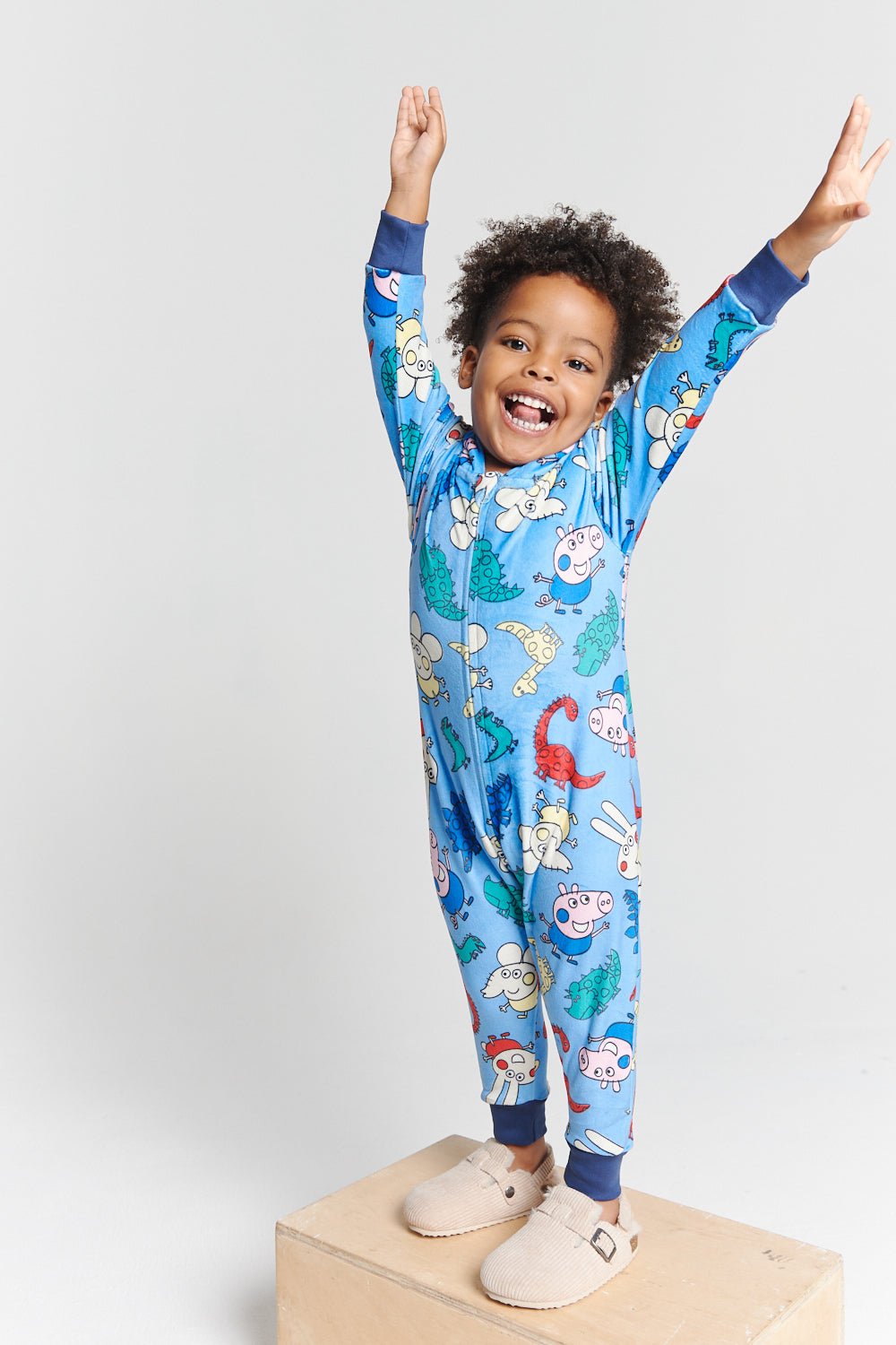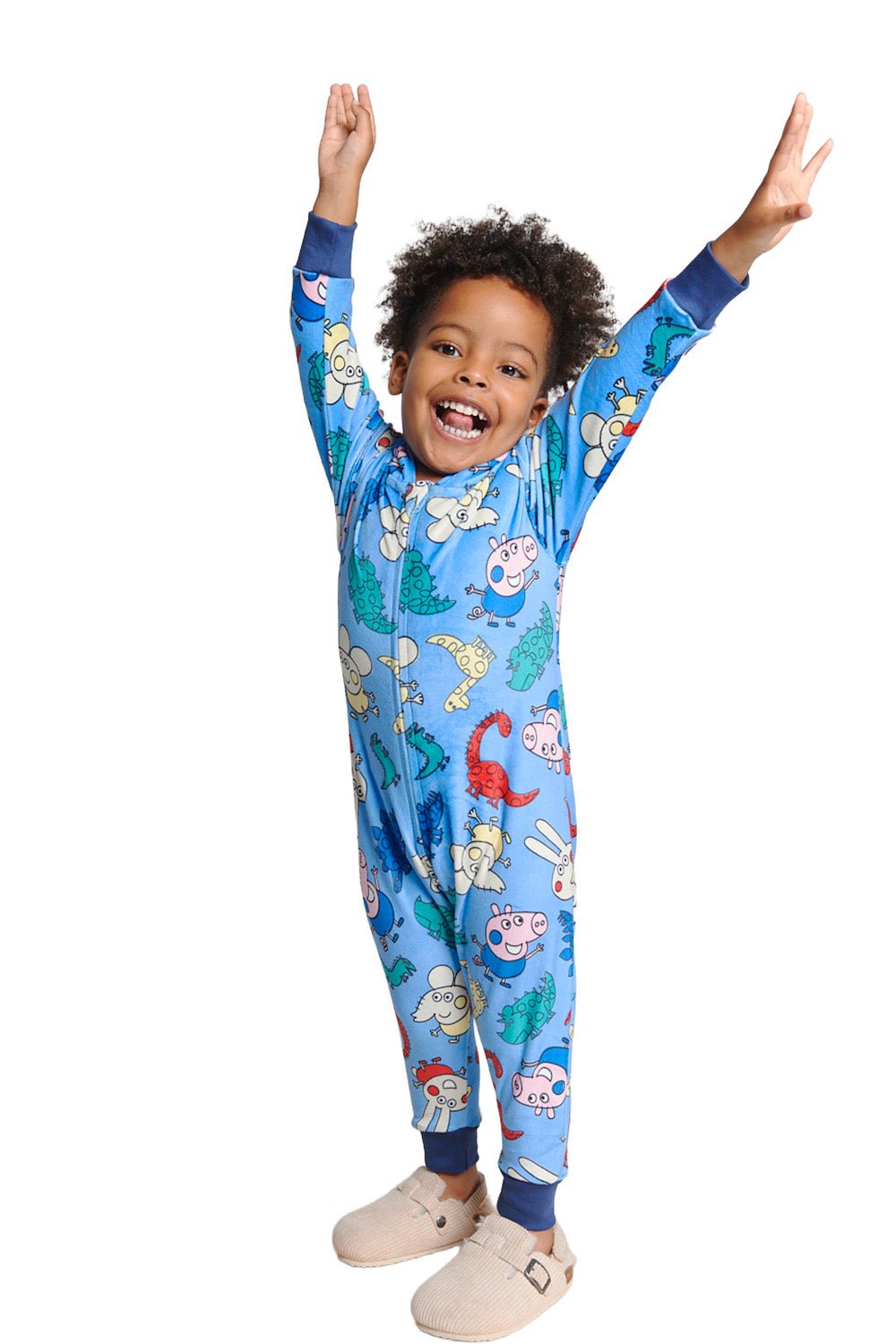 Snuggle up with George Pig and his favourite dinosaur in this adorable George Pig Boys Fleece Onesie – the ultimate bedtime companion for little Peppa Pig fans! This bright blue sleepsuit features colourful all-over prints of George, dinosaurs, and fun clouds that bring a cheerful bedtime look.