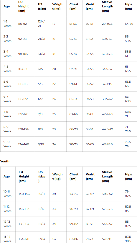 | Age | EU Height (cm) | US (size) | Weight (kg) | Chest (cm) | Waist (cm) | Sleeve Length (cm) | Hips (cm) |