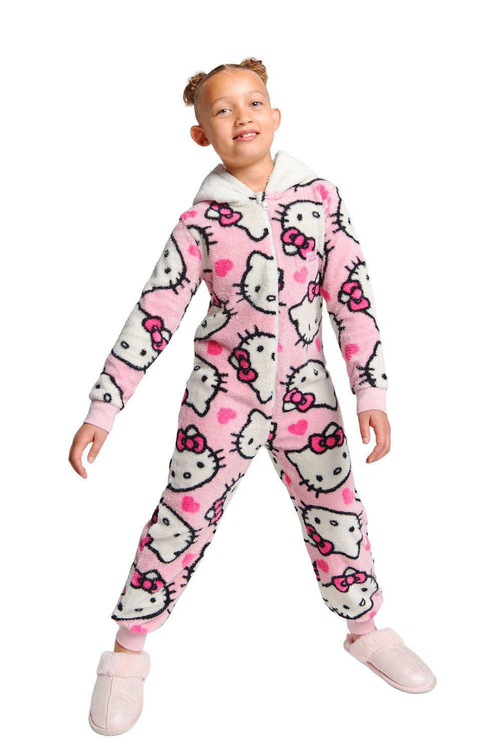 Say hello to the ultimate cosy nightwear with this Hello Kitty Girls Fleece Onesie, officially licensed and designed with fans of Sanrio’s beloved character in mind. Featuring a playful all-over Hello Kitty print, this onesie also includes a 3D character hood with embroidered face, pink bow, and soft plush ears – perfect for sparking smiles at bedtime.