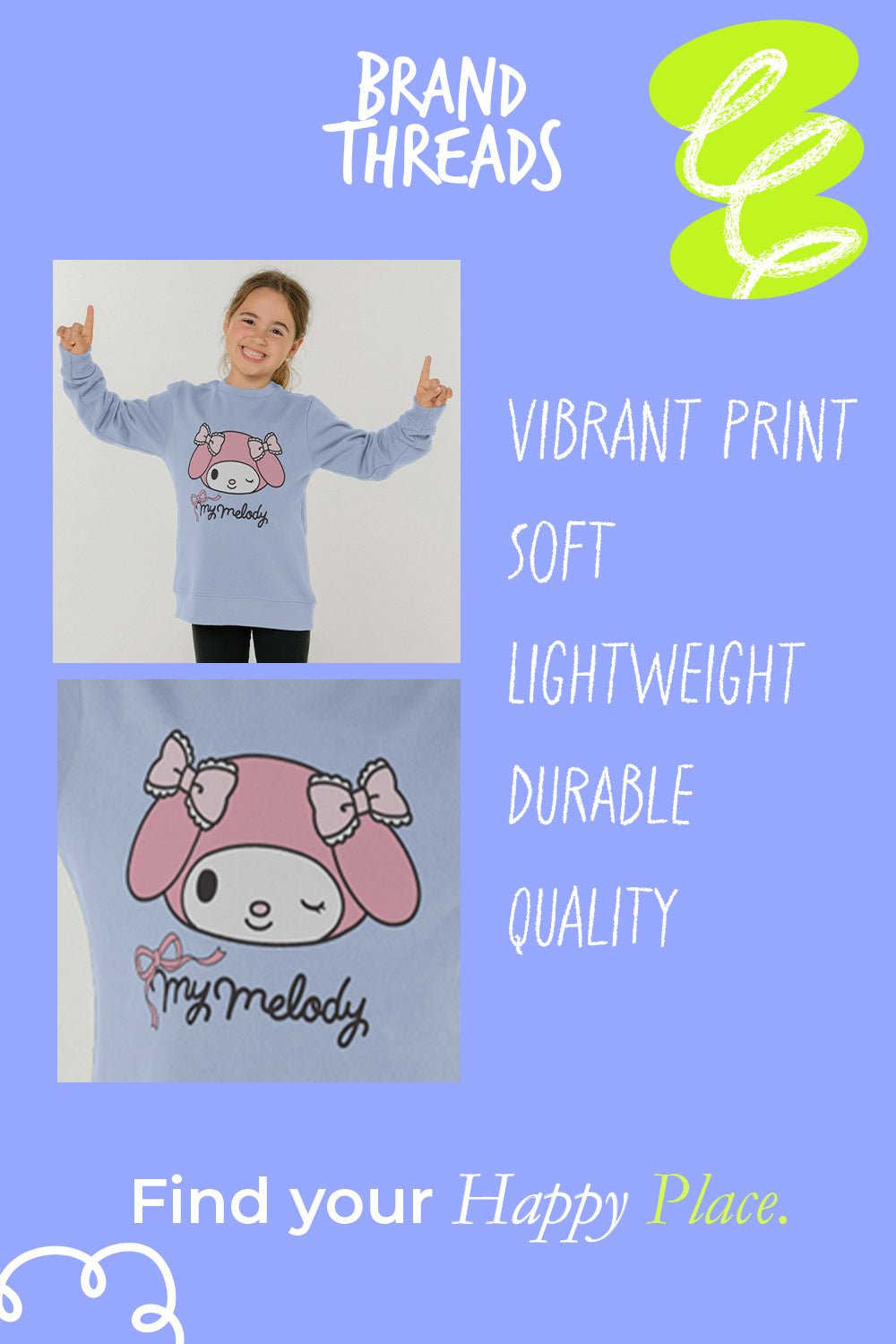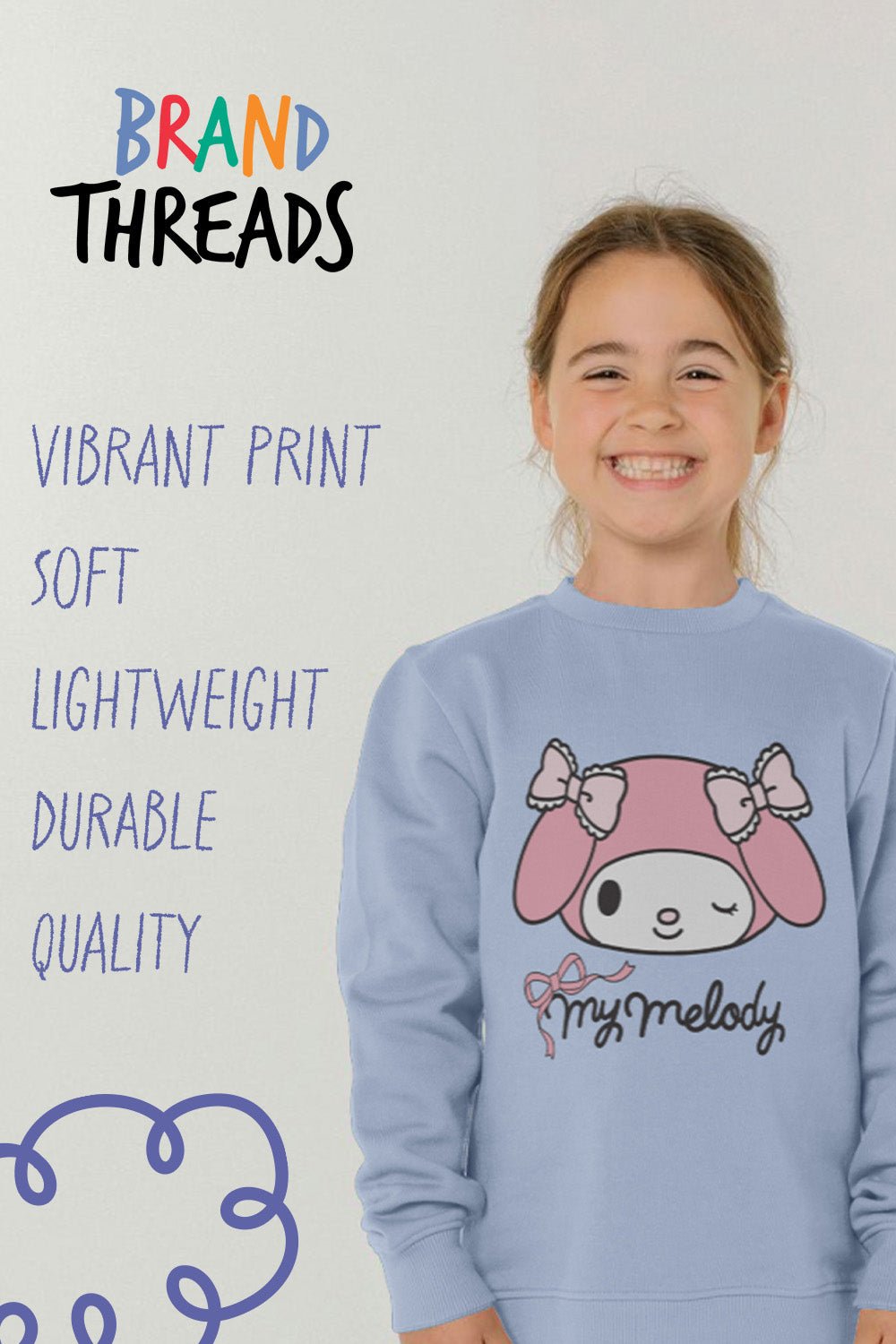 Delight your little one with this adorable My Melody sweatshirt, perfect for fans of the iconic Sanrio character. Designed in a pretty blue shade, it brings both style and comfort to everyday wear. Whether worn for a casual outing or cosy days at home, this sweatshirt keeps kids warm and looking great.