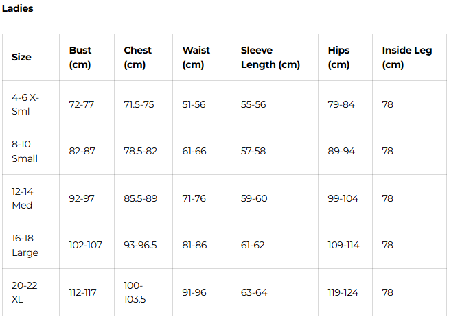 | Size | Bust (cm) | Chest (cm) | Waist (cm) | Sleeve Length (cm) | Hips (cm) | Inside Leg (cm) |