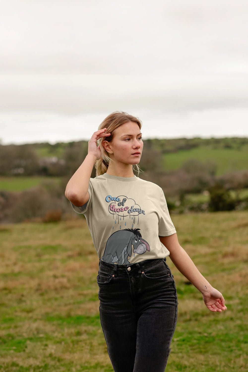 Meet your new go‑to graphic tee. With Eeyore under a drizzly cloud and the caption “One of those days”, this ladies T‑shirt brings a little Hundred Acre Wood humour to everyday outfits. The Natural shade keeps looks soft and easy to style, while the relaxed, short‑sleeve cut is built for comfort on coffee runs, sofa days and strolls through the park.